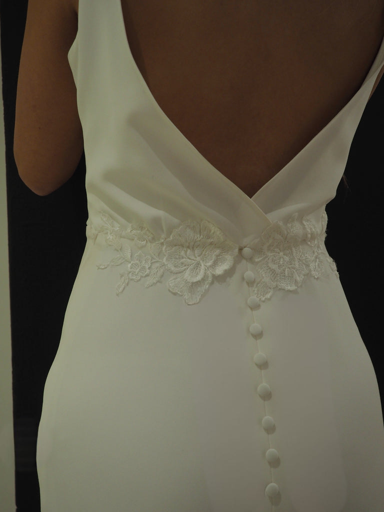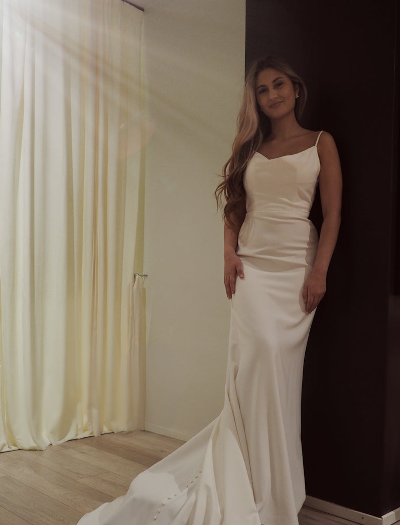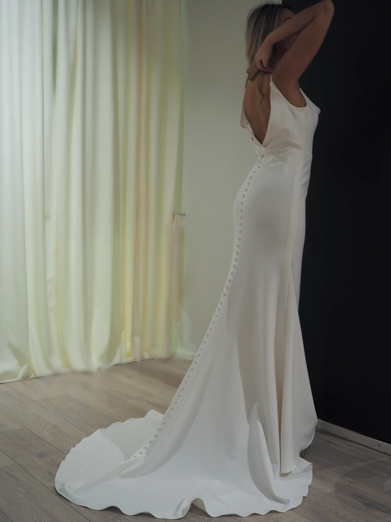 Fantastisen kaunis, minimalistinen hääpuku drapeeratulla yläosalla ja rennosti avonaisella selällä, joka tuo pehmeää seksikkyyttä pukuun.