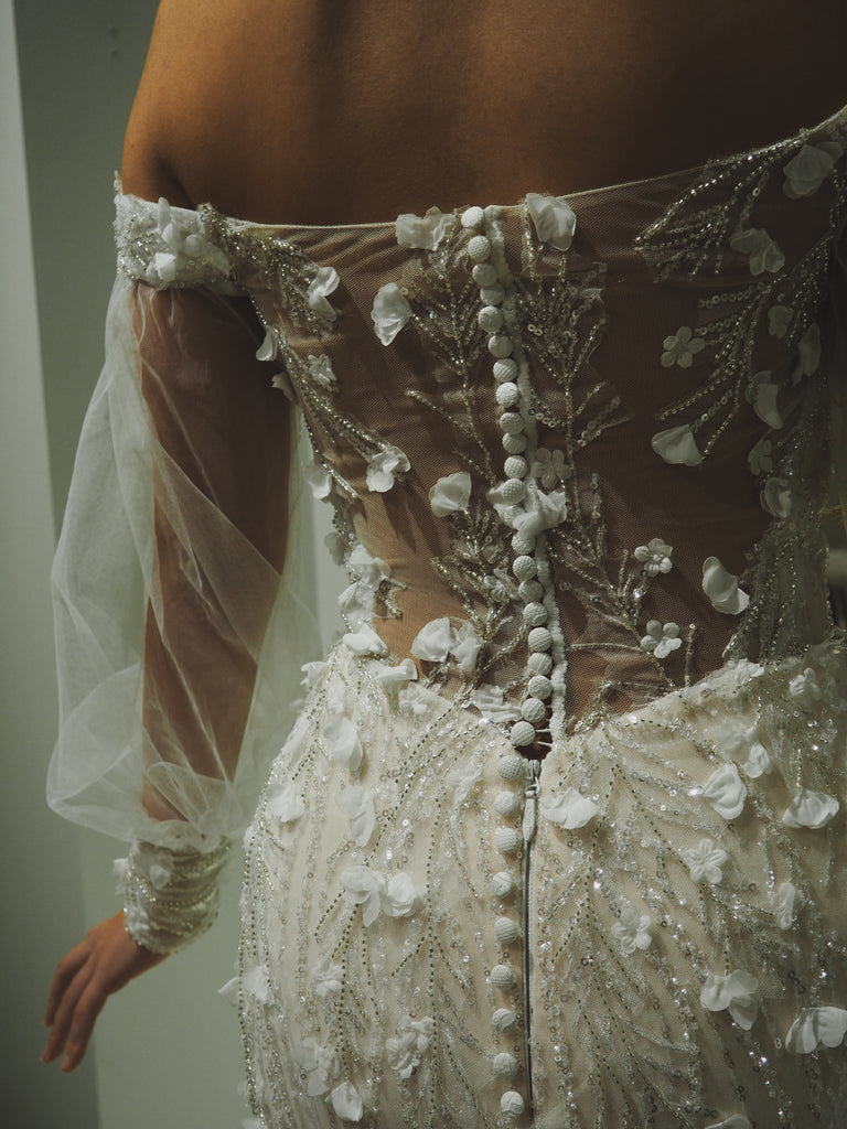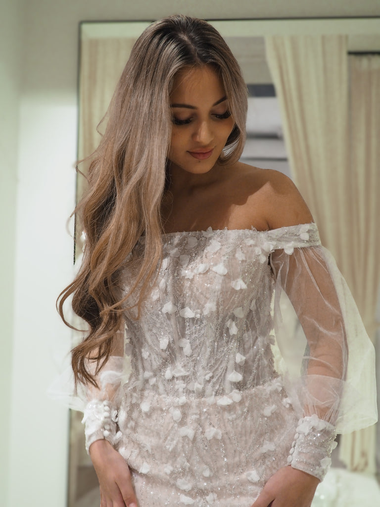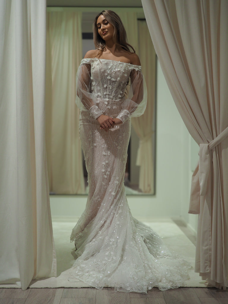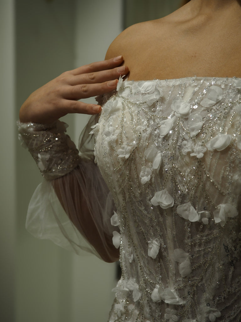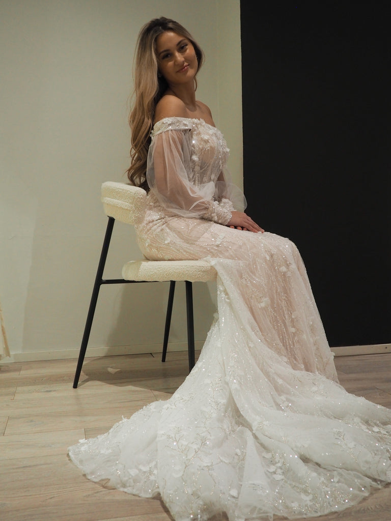Tämä upea off shoulder -hääpuku hurmaa ylellisyydellään ja herkällä naisellisuudellaan.