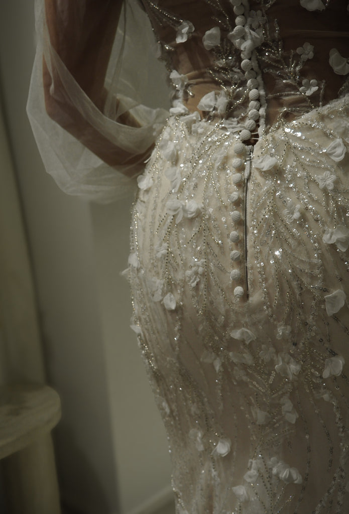 Puku on kauttaaltaan koristeltu hohtavilla paljeteilla, helmikirjailuilla ja 3D-kukkaplikoinneilla, jotka luovat lumoavan, valossa sädehtivän pinnan. Muotoileva korsettimainen yläosa korostaa kauniisti vartalon linjoja ja luo täydellisen ryhdin.